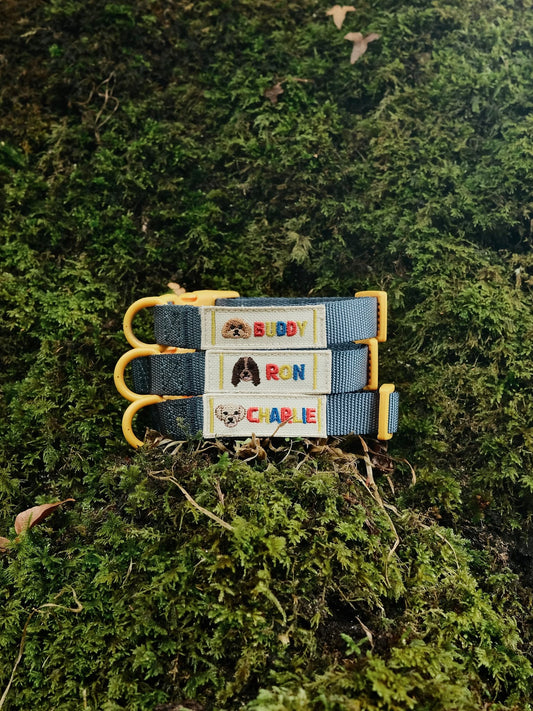 Our Newest Addition to the pack! Every dog is unique and we we are here to make your pup feel special! Choose your dogs breed, enter their name and *Voila* - We'll create a handmade embroidered collar just for you (and your pup!).